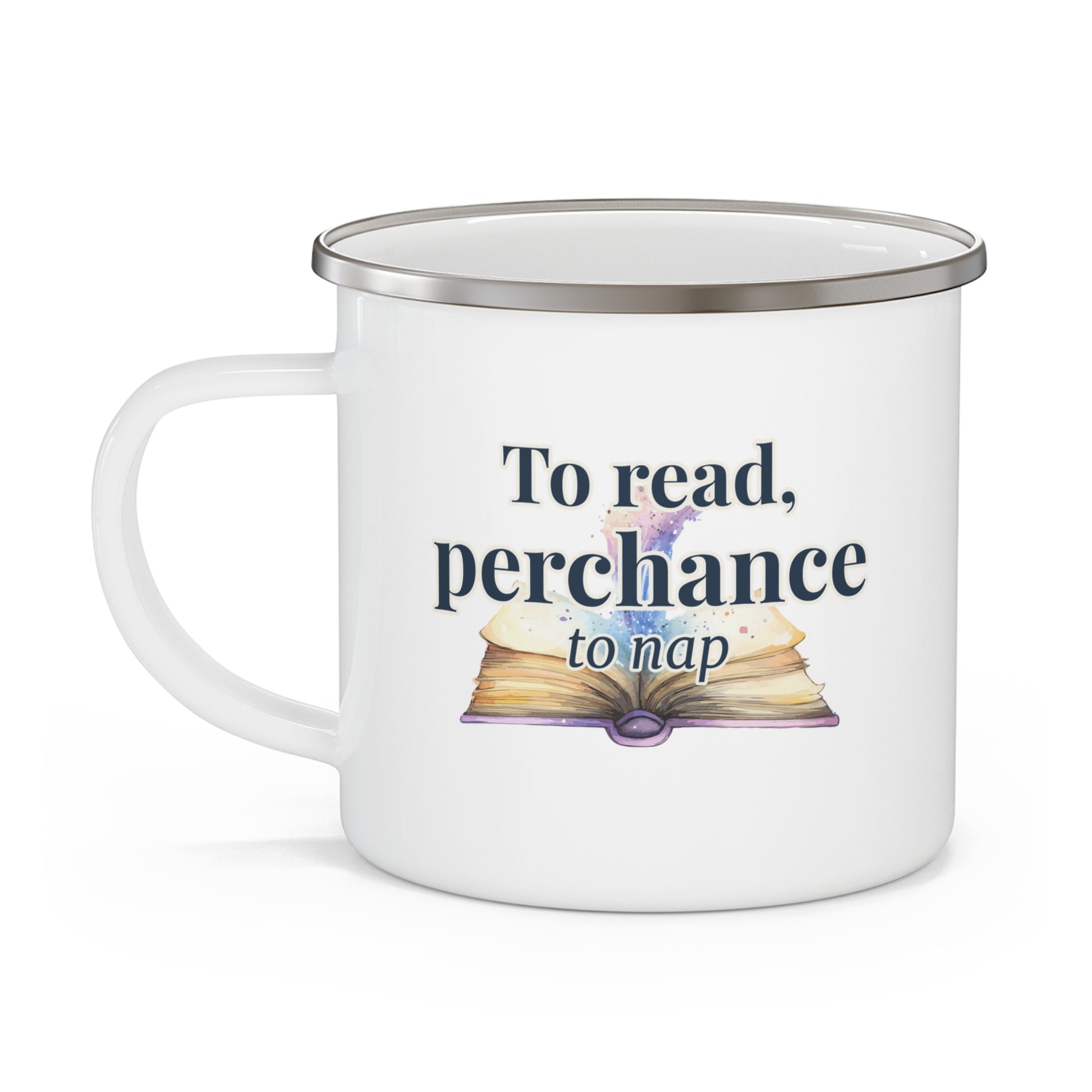 This enamel camping mug features a quote 'To read, perchance to nap' on a book full of magic design. It gives a cozy and whimsical vibe, perfect for those who enjoy reading and nature. Great for camping trips, outdoor adventures, or just sipping a warm drink at home. Ideal for book lovers, campers, and nature enthusiasts. Relevant for cozy nights, camping trips, bookworm birthdays, and outdoor events.