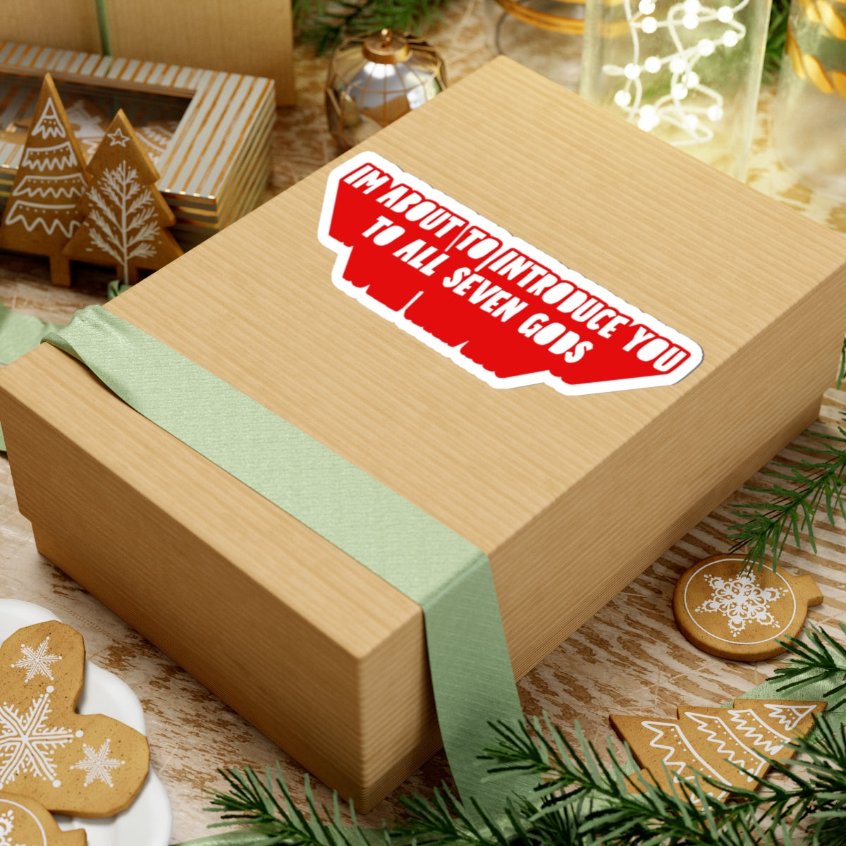A bold, conversation-starting sticker that reads “I'M ABOUT TO INTRODUCE YOU TO ALL SEVEN GODS” in chunky, high-contrast lettering. Printed on durable vinyl with a glossy finish and bright, eco-solvent inks, this kiss-cut sticker brings vivid color and a slightly retro, fan-driven edge to laptops, journals, water bottles, and windows. The compact, angular shape and white border give it presence without overwhelming surfaces. Fans of intense fandom humor and dramatic one-liners will appreciate the punchy attitude — stick it where other fans can see it and watch reactions unfold.