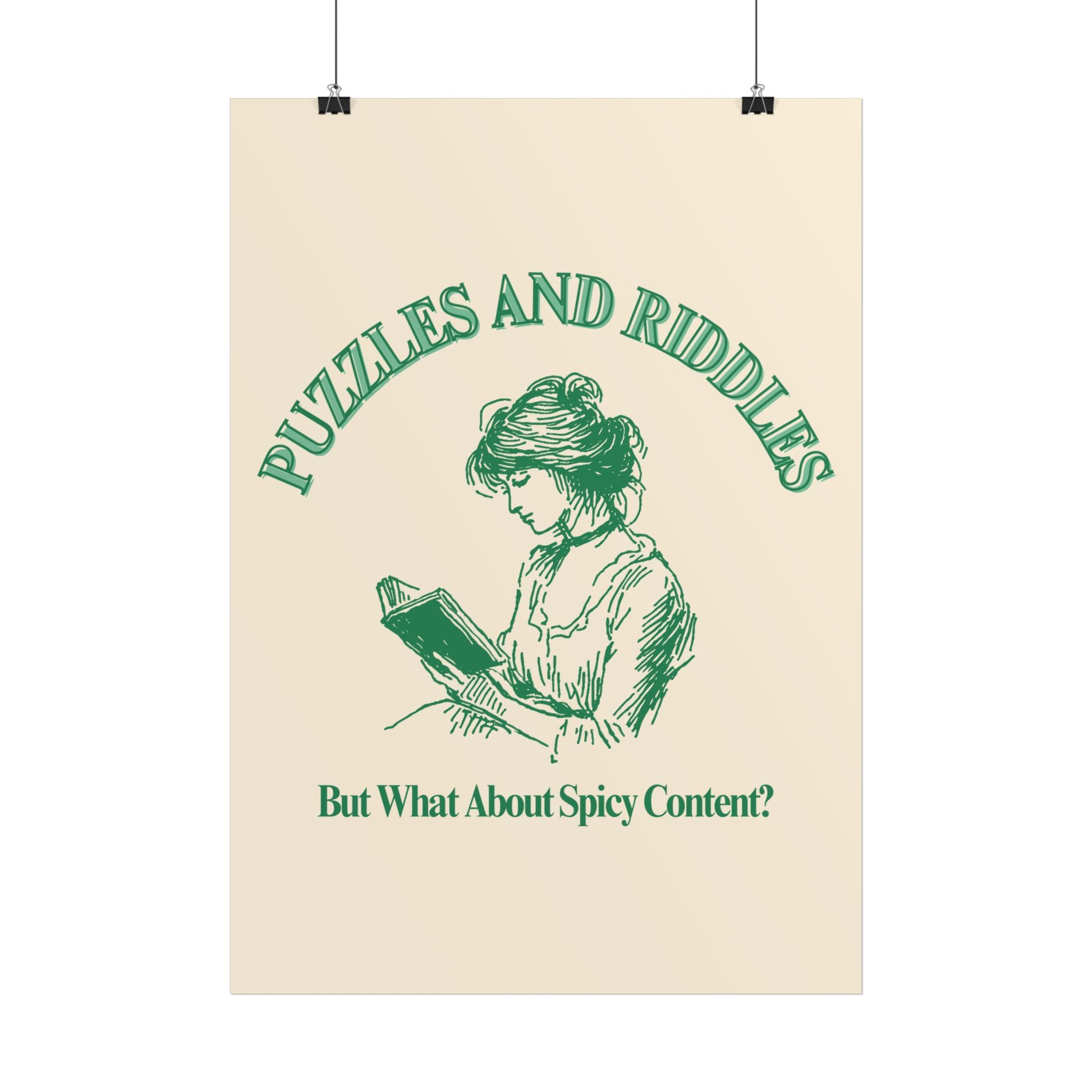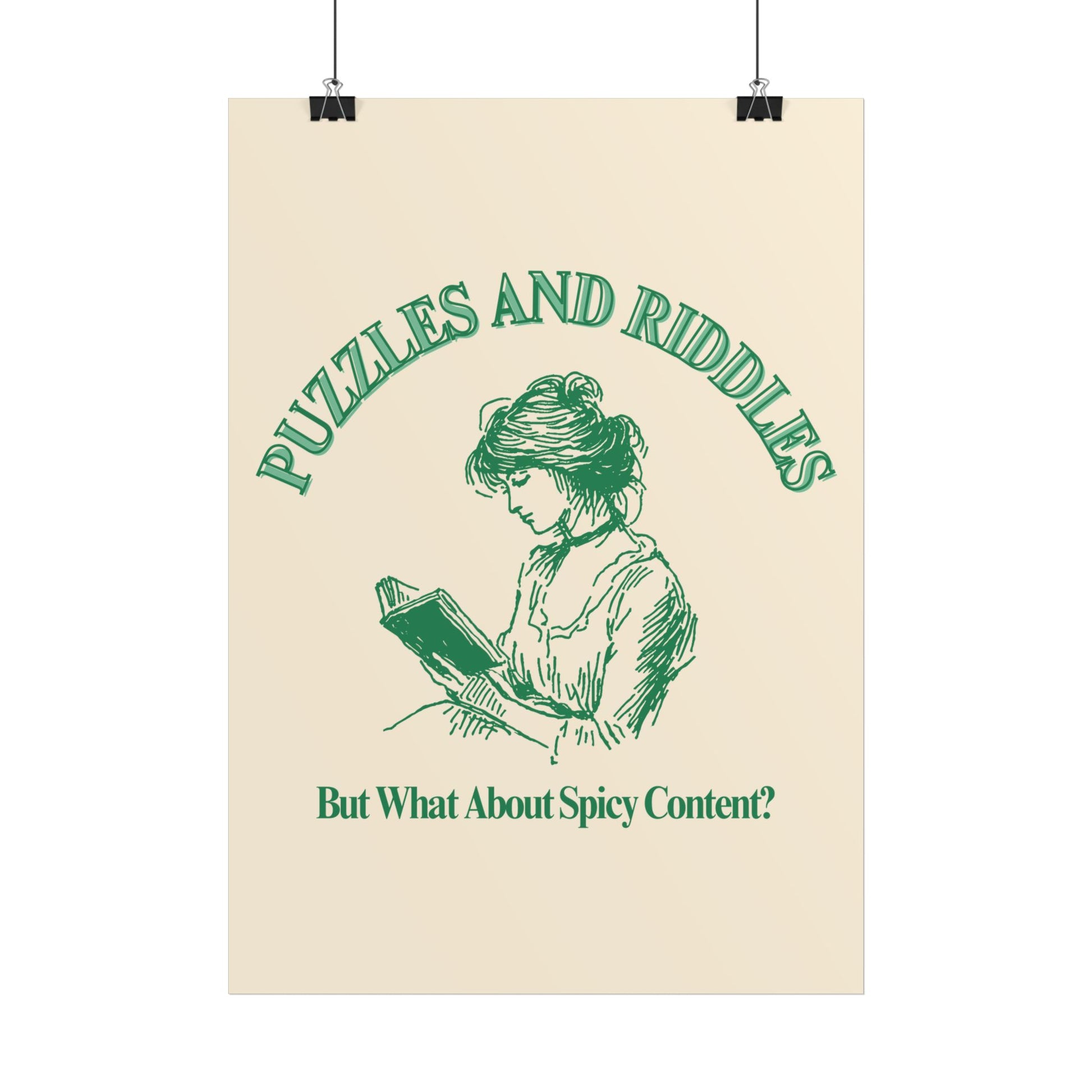 Soft cream paper, green vintage illustration, and a wry line—this poster brings bookish charm and sly humor to a reading nook or game room. The retro-engraving of a woman absorbed in a book sits beneath arched lettering: “PUZZLES AND RIDDLES,” with the playful subtext, “But What About Spicy Content?” It feels like a wink from a private club of puzzle-lovers and late-night solvers — low-key, witty, and a little mischievous. Hung above a desk, pinned beside a bookshelf, or framed on a gallery wall, it adds personality without shouting. The design’s muted tones and classic layout complement eclectic, vintage, or minimalist decor, and the archival paper keeps the print looking crisp for years.